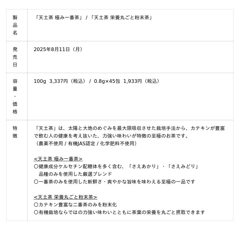 お茶石鹸の悠香、天土茶(てんとちゃ)ブランドから「極み一番茶」・「栄養丸ごと粉末茶」を新発売