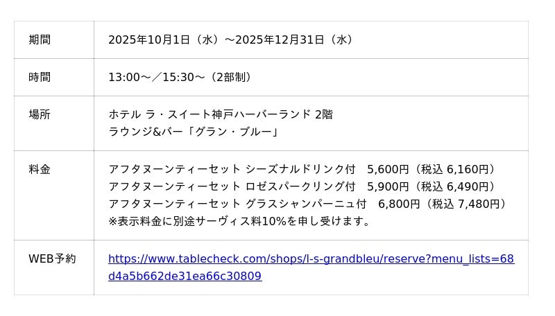 ホテル ラ・スイート神戸ハーバーランド(総支配人:檜山 和司 所在地:神戸市中央区)では、2025年10月1日から12月31日までラウンジ&バー グラン・ブルーで「LA SUITE Grand Harvest Afternoon Tea」を提供いたします。