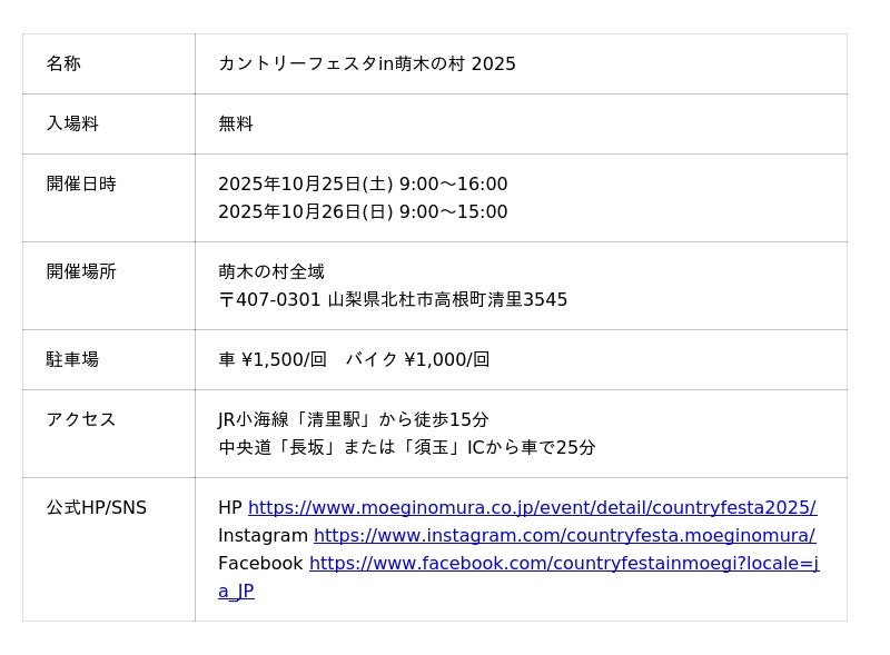 萌木の村株式会社(代表取締役社長舩木上次、山梨県北杜市高根町清里3545)は、2025年10月25日(土)~26日(日)の2日間、「カントリーフェスタin萌木の村 2025」を開催いたします。“ナチュラルライフが心地よい!(Natural Life is Comfortable!)”をテーマに、主婦と生活社の人気雑誌「私のカントリー」のイベントとしてスタート。今年で25回目の開催を迎えました。