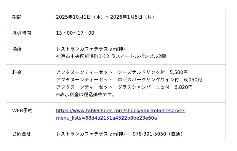 ◆お客様のお問合せ先:レストランカフェテラス ami神戸 078-391-5050(直通)