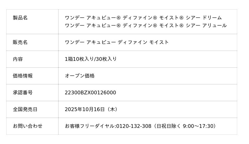 ジョンソン・エンド・ジョンソン*は、瞳本来の美しさを引きだすデザインの1日使い捨てカラーコンタクトレンズ「ワンデー アキュビュー(R) ディファイン(R) モイスト(R) 」シリーズから、新製品「ワンデー アキュビュー(R) ディファイン(R) モイスト(R) シアー ドリーム」と「ワンデー アキュビュー(R) ディファイン(R) モイスト(R) シアー アリュール」を2025年10月16日(木)に、全国発売します。本製品は、瞳にとけこみなじみ、近寄ってもきれいなデザインのアキュビュー(R) ディファイン(R) 独自の高解像度(1)「ぼかしフチ(2)」カラーコンタクトレンズです。