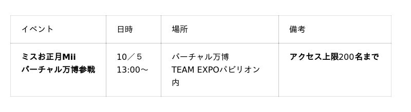 さらに、バーチャル万博では、女優デビューとなる映画出演で話題のミスお正月Miiがサプライズ登場します。リアル会場では会えない彼女が、地元愛媛県宇和島市からバーチャル万博に参戦し、来場者と交流します。