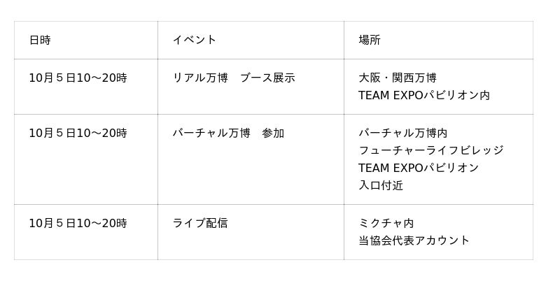 当協会は、以前から10月5日のブース展示を計画していました。そうした中、万博会場が連日満員となり、多くの来場者が現地での体験機会を失う中、私たちはこの閉塞感を打破すべく、にわかに盛り上がりつつある「バーチャル万博」に注目しました。
