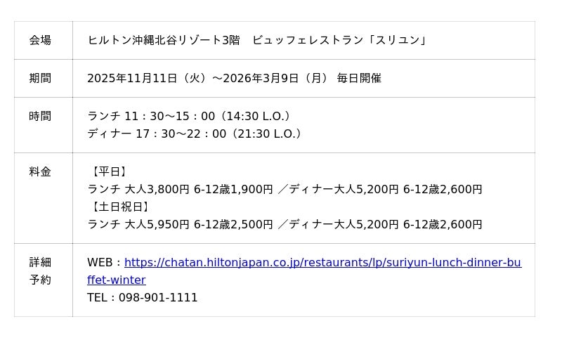 【2025年10月2日】ヒルトン沖縄北谷リゾート(北谷町(ちゃたんちょう)美浜(みはま) 統括総支配人 宍倉裕(ししくらゆたか))は、ビュッフェレストラン「スリユン」にて、2025年11月11日(火)から2026年3月9日(月)まで、四季折々の食材を活かした「季節を映す和の一皿」和食フェアを開催いたします。秋から冬へと移りゆく季節のうつろいを、繊細な味わいと美しい盛り付けで表現した和のメニューが並び、訪れる皆さまに心豊かな食のひとときをお届けします。