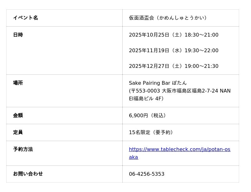 ぽたん株式会社(本社:大阪市福島区福島2丁目7-24 4F、代表取締役:久米 佑宜)が運営する体験型日本酒バー「Sake Pairing Bar ぽたん」で人気の日本酒ブラインドテイスティングイベント「仮面酒盃会」を、2025年10月25日(土)に開催します。