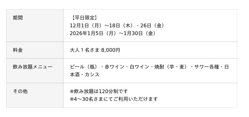 【平日限定】忘年会・新年会プラン