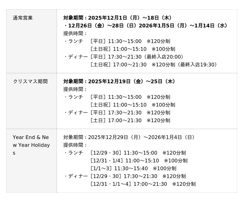 期間ごとの営業時間