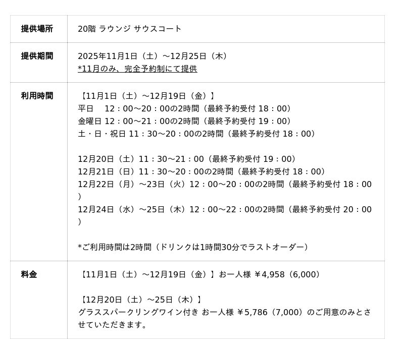 提供期間:2025年11月1日(土)~12月25日(木)華やかなホリデーシーズンにおすすめのウインターカクテルを3類ご用意しました。当ホテルの若手スタッフが考案したカクテルで乾杯すればいつもよりゴージャスな気分に。