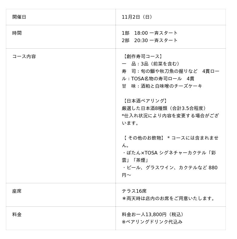 ぽたん株式会社(本社:大阪市福島区福島2-7-24 4F、代表取締役:久米 佑宜)が運営する「Sake Pairing Bar ぽたん」は、2025年11月2日(日)に株式会社infix(大阪市中央区北浜、代表取締役社長:間宮 尊)が運営するブティックホテル「THE BOLY OSAKA」1階レストラン「TOSA - Riverside Sushi Bar -(トーサ)」とのタイアップイベントを開催します。厳選した希少銘柄を含む日本酒と、旬魚を使った創作寿司のペアリングコースを32名様限定(1部8組16名×2部制)で提供する一夜限りの特別ディナーです。当日はTOSAのリバーサイドテラスを特設の大きなカウンター席に見立て、中央公会堂を臨む開放的な川沿いのロケーションで、秋の夜長に日本酒と寿司のマリアージュをご堪能いただけます。