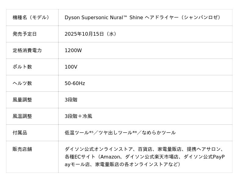 ダイソン株式会社(東京都千代田区: 代表取締役社長 添田 成久、以下ダイソン)は、「Dyson Supersonic Nural(TM) Shine ヘアドライヤー」に、このホリデーシーズンを華やかに彩る数量限定カラー「シャンパンロゼ」を新たにラインナップします。2025年10月15日(水)より、ダイソン公式オンラインストア、百貨店、家電量販店、提携ヘアサロンなどにおいて順次発売します。
