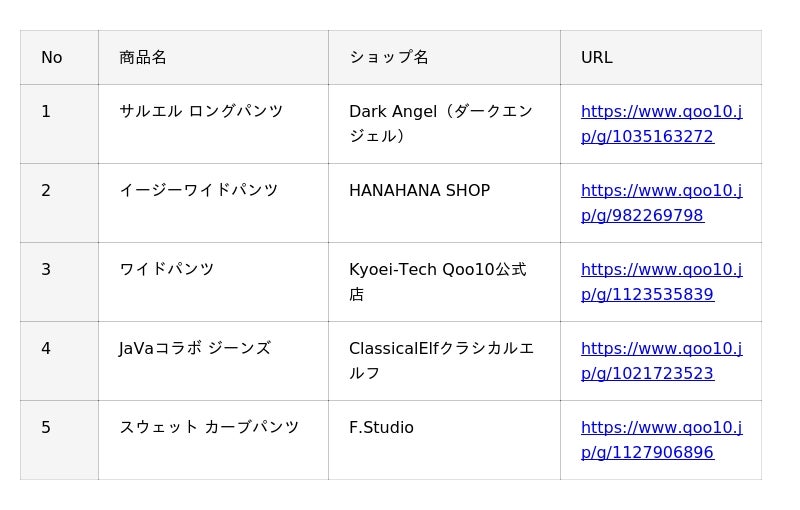 Qoo10(https://www.qoo10.jp/)サイト上、「ロングパンツ」カテゴリーの各販売個数に基づいたランキングです。