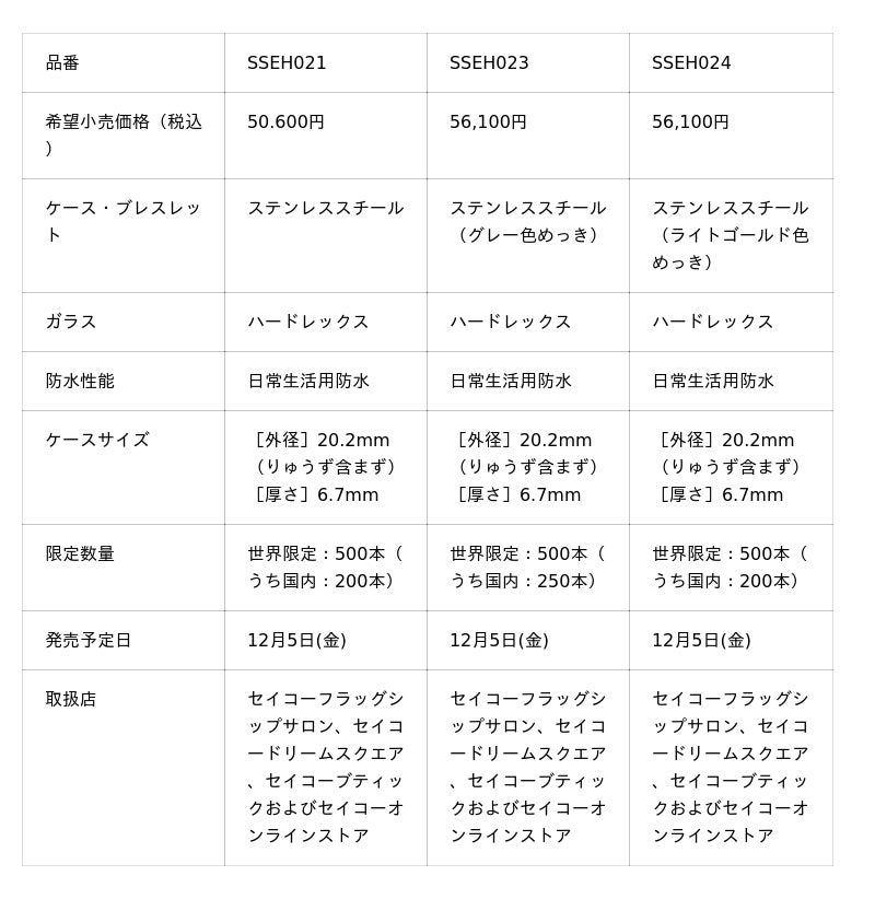 セイコーウオッチ株式会社(代表取締役会長 兼 CEO 兼 CCO:服部 真二、本社:東京都中央区)は、腕時計の新しい可能性を提案する<セイコー パワーデザインプロジェクト>のコレクションを発表いたします。第1弾は12月5日(金)より、希望小売価格は50,600円~56,100円(税込)、各世界限定500本で発売いたします。
