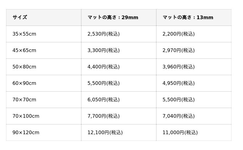 マットの高さ(2種類): ふんわりと贅沢な踏み心地の「29mm」と、お手入れしやすい「13mm」