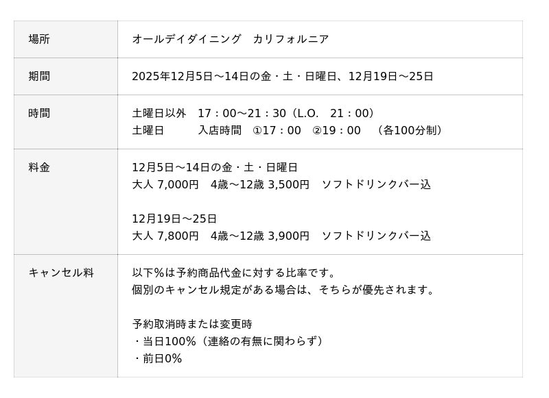 東京ディズニーリゾート(R)・オフィシャルホテルの東京ベイ舞浜ホテル ファーストリゾート(千葉県浦安市舞浜1-6)では、2025年12月5日から「クリスマスディナービュッフェ」を開催いたします。