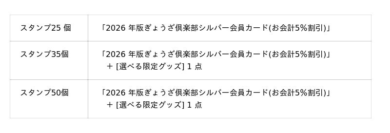 集まったスタンプの数に応じて、お会計が毎回5%割引になる「ぎょうざ倶楽部シルバー会員カード」をはじめ、数量限定の餃子の王将オリジナルグッズと交換できます。