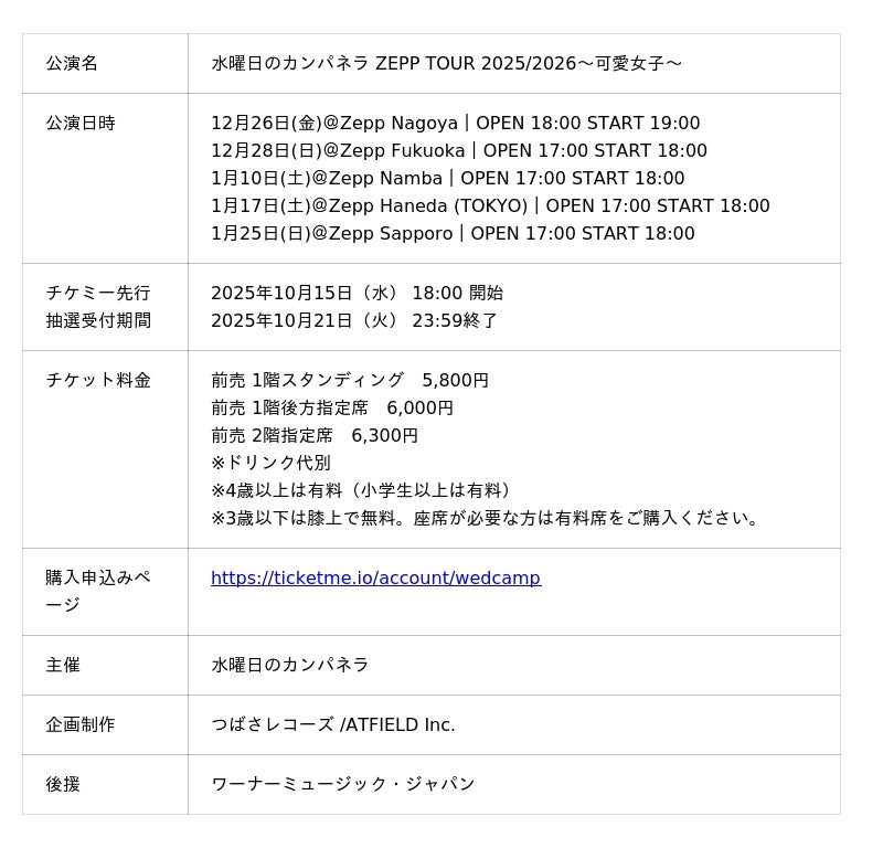 株式会社チケミー(本社:東京都港区、代表取締役:宮下大佑)が運営する電子チケットプラットフォーム「TicketMe(チケミー)」は、人気音楽ユニット・水曜日のカンパネラによる全国ツアー「ZEPP TOUR 2025/2026~可愛女子~」のチケット販売を開始いたしました。