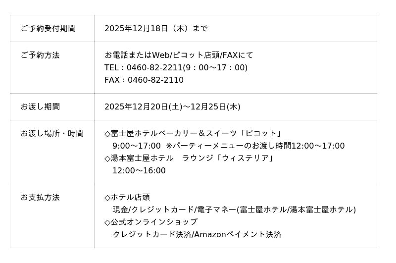 ケーキは、定番の「ショートケーキ」に加え、チョコレートクリームとチェリーコンポートが織りなす甘酸っぱいハーモニーが魅力の「ショコラ・セレーズ」、そして富士屋ホテルならではの懐かしく上品な「バタークリームケーキ」の3種類をご用意。さらに、ローストチキンを中心とした豪華なパーティーメニューも3種類取り揃えております。今年のクリスマスは、富士屋ホテルの特製メニューで、食卓を華やかに彩ってみませんか。