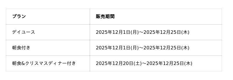 様々なライフスタイルに合わせてお楽しみいただけるよう、お食事なしのデイユース、朝食付き、また12/20(土)~12/25(木)の期間楽しめる、朝食&クリスマスディナー付きの3つのプランをご用意いたしました。