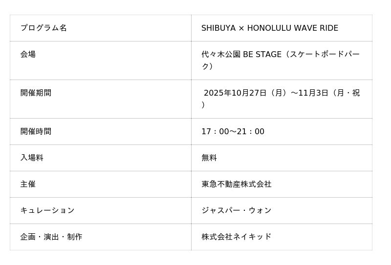 株式会社ネイキッド(英語表記:NAKED, INC.、所在地:東京都渋谷区、代表:村松亮太郎)は、渋谷区とホノルル市の姉妹都市提携(2024年5月締結)を記念し、ネイキッドがプロデュースする新たな文化交流プログラムを2025年10月27日(月)~11月3日(月・祝)まで無料で開催します。代々木公園BE STAGEのスケートボードパークを舞台に、ハワイのアーティストによる作品とスケーターの動きが呼応するデジタルアート体験『SHIBUYA × HONOLULU WAVE RIDE 』を展開。都市と自然、スケートとサーフが融合するインタラクティブなプロジェクションマッピングを体験いただけます。