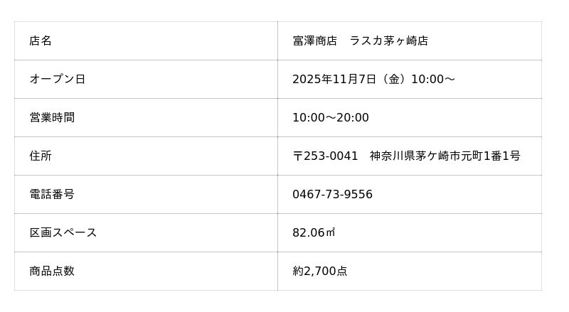 日本最大級の製菓・製パン材料、器具専門店として創業106年の株式会社富澤商店は、2025年11月7日(金)に「富澤商店 ラスカ茅ヶ崎店」をオープンいたします。湘南エリアでは2店舗目、茅ヶ崎市内では初出店となる同店は、駅直結でアクセスしやすい「ラスカ茅ヶ崎」1階に位置し、製菓・製パン材料など約2,700点の商品を取り揃えます。オープンを記念して、11月7日(金)~11月9日(日)の3日間限定で、人気のペーストシリーズや豆菓子セットなど、ここでしか手に入らない特別企画を実施いたします。