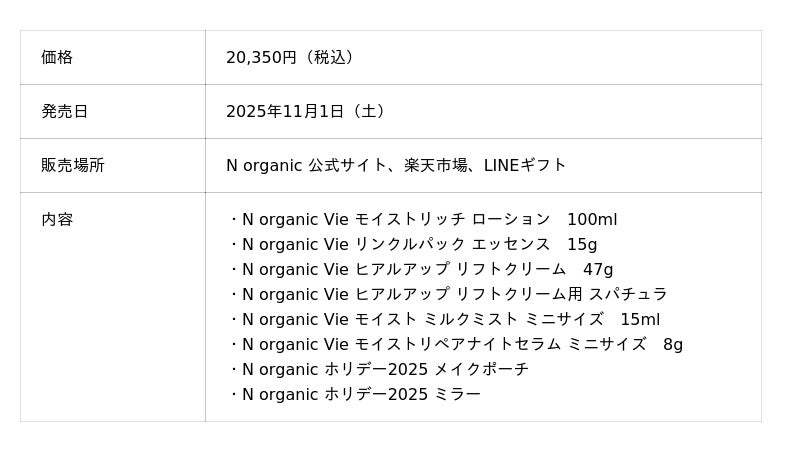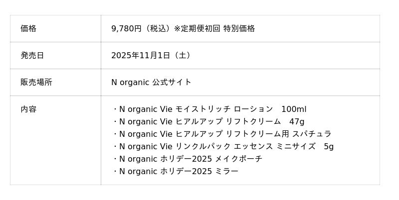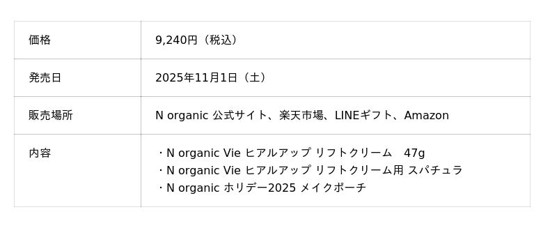 「N organic Vie ヒアルアップ リフトクリーム」の単品価格で、スパチュラとホリデー限定ポーチが付属する今だけの特別なセットです。1年頑張った自分へのご褒美や、ギフトにもぴったりのアイテムです。