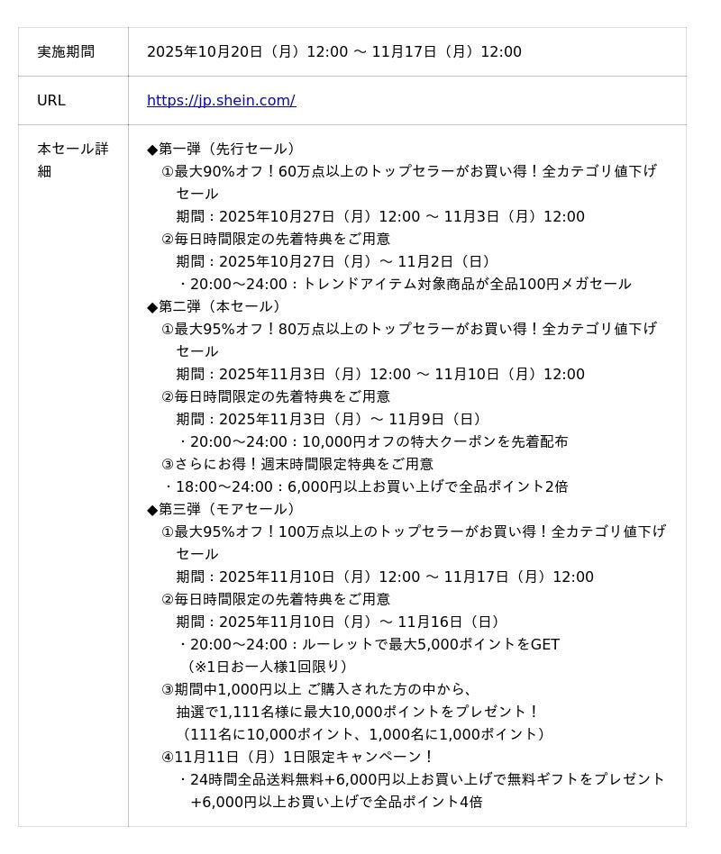 この度SHEINは、11月11日(火)の大型ショッピングイベントに合わせ、2025年10月20日(月)12:00から11月17日(月)12:00までの期間、最大級のセール「#SHEIN1111」を開催します。