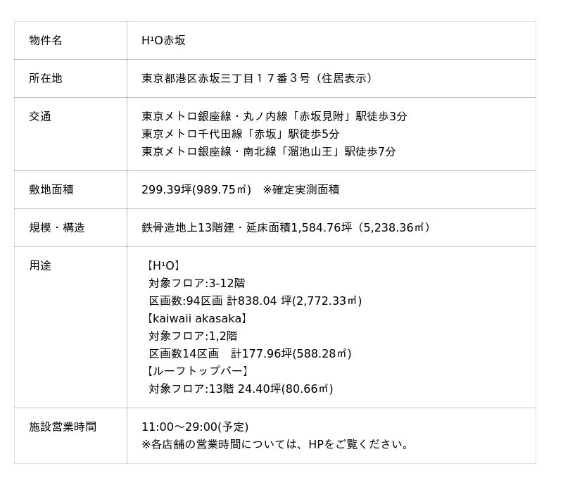 野村不動産株式会社(本社:東京都港区/代表取締役社長:松尾 大作、以下「野村不動産」)、野村不動産コマース株式会社(本社:東京都港区/代表取締役社長:鵜沼 孝之、以下「野村不動産コマース」)は野村不動産が開発するオフィスビル「H¹O(エイチワンオー)赤坂(東京都・港区/以下「本物件」)」内に、新しい飲食空間「kaiwaii akasaka」を、2025年10月29日(水)に開業することをお知らせいたします。