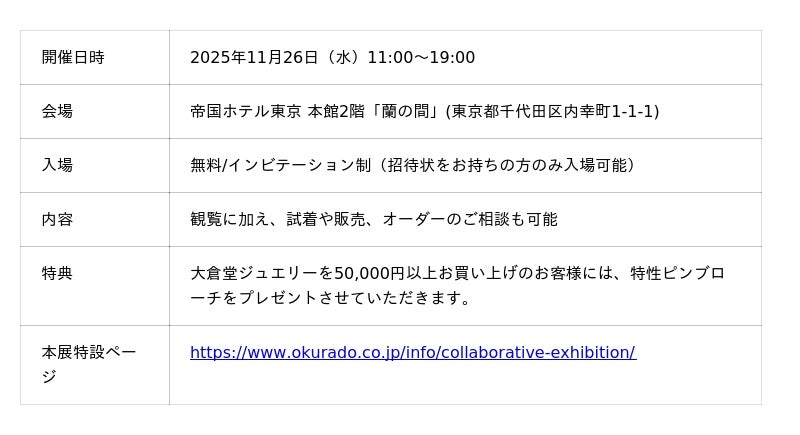 株式会社大倉(本社:東京都港区、代表取締役:大倉明美)が運営する日本発のハイジュエリーブランド大倉堂 -OKURADO-(以下、大倉堂)は、2025年11月26日(水)、帝国ホテル「蘭の間」にて、京友禅を手がける株式会社千總(本社:京都市中京区、代表取締役社長:礒本延)のブランド千總 -CHISO-(以下、千總)との初のコラボレーション展示を開催いたします。本展では、大倉堂の新作一点物ジュエリーをはじめ、コレクションの数々を一堂に展示するほか、千總の美意識と融合させた特別なディスプレイも展開します。