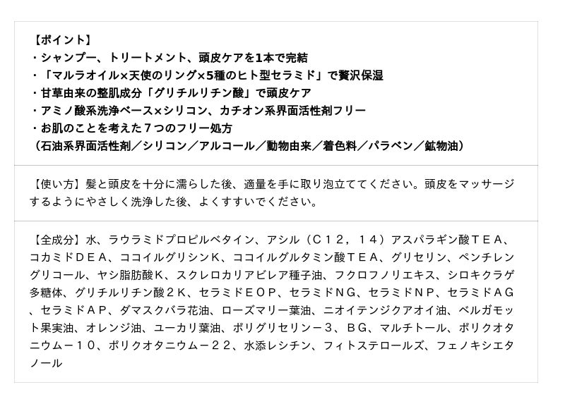 「マルラオイル×天使のリング×5種のヒト型セラミド」で贅沢保湿。「グリチルリチン酸2K」で頭皮ケアも。ブランドキー成分であり保湿力に優れる「マルラオイル(※1)」に加え「5種のヒト型セラミド(※2)」、海藻由来の保湿成分であり髪にツヤを与える「天使のリング(※3)」配合。贅沢な保湿成分で髪と頭皮を乾燥から守ります。しっとり感とツヤを長時間保ち、指通りのよい仕上がりに。