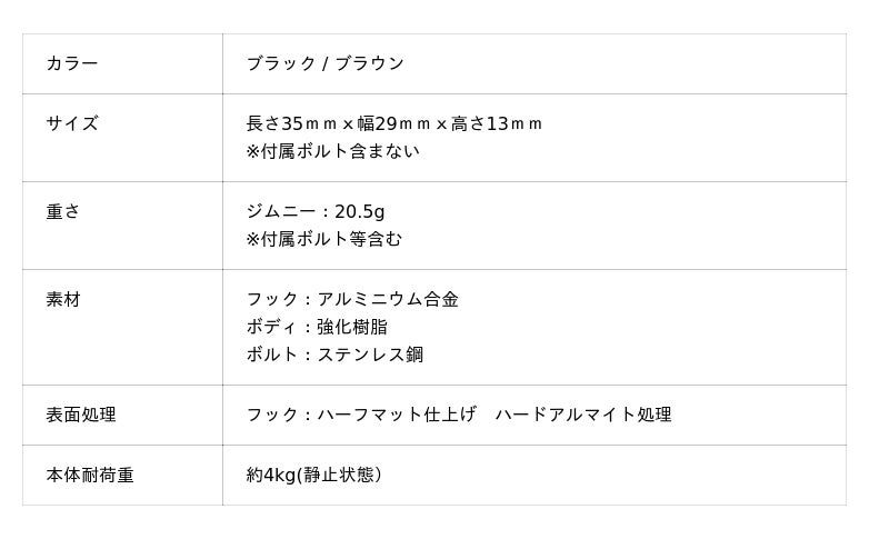- 高強度かつ軽量設計:アルミフック+強化樹脂ベース+ステンレスボルト構成