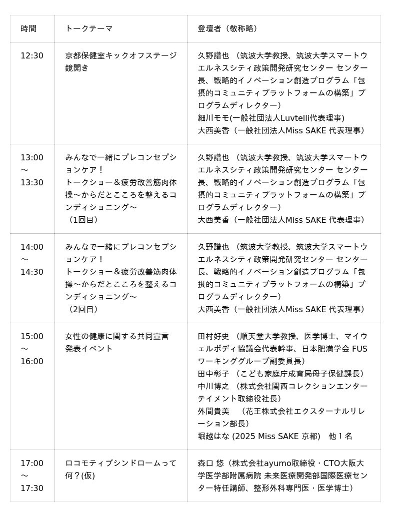 11月6日の京都駅前広場でのステージでは、日本を代表するヘルスケアの専門家たちが登壇します。ぜひ、登壇者へのインタビュー取材など、ご検討ください。▶ステージ1.(13:00~13:30、14:00~14:30):プレコンセプション世代の健康課題である低体重・低栄養、骨密度、月経不順、不妊などを分かりやすく解説し、それに取り組む企業や団体の取り組み、内閣府の<SIP~戦略的イノベーション想像プログラム~>の女性の健幸の取り組みをご紹介します。