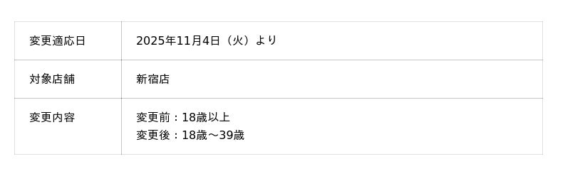 これまで新宿店では18歳以上の方にご利用いただいておりましたが、お客様からのフィードバックや実際のご利用状況をふまえ、新宿店を「同世代間のマッチング」により特化した店舗とするため、