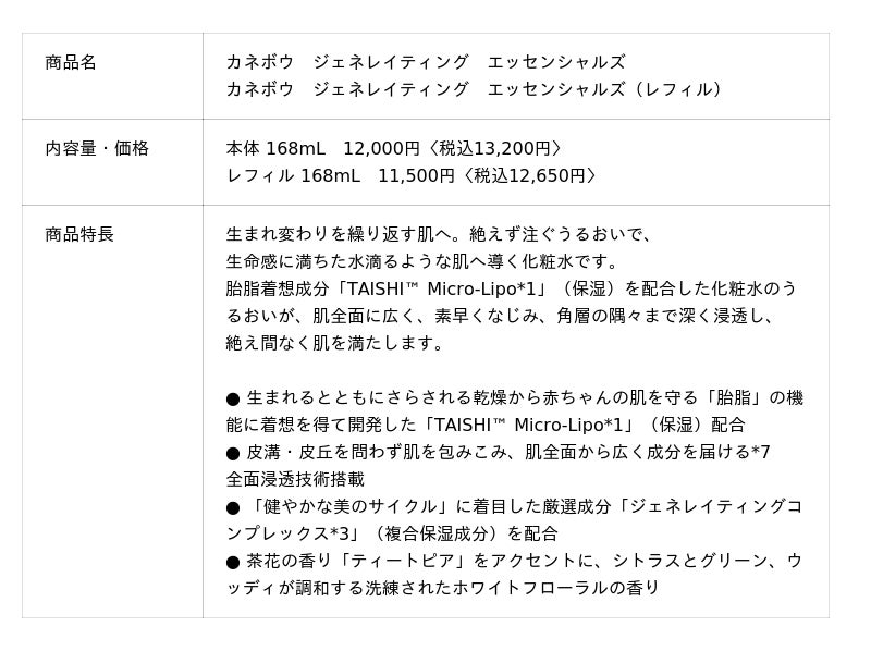 『カネボウ ジェネレイティング エッセンシャルズ』は、角層のすみずみまでうるおいを届け、透明感とツヤのある生命感に満ちた水滴るような肌へ導く美容化粧水です。長期の研究を重ねた花王独自の製剤化技術により、赤ちゃんの肌を乾燥から守る「胎脂」の機能に着想を得た複合保湿成分「TAISHI(TM) Micro-Lipo*1」を配合した化粧水を初めて開発*2しました。さらに、皮溝・皮丘を問わず肌を包み込み、化粧水を肌全体にムラなくなじませて角層へ浸透させる「全面浸透技術」を採用。「TAISHI(TM) Micro-Lipo*1」と「全面浸透技術」を掛け合わせた処方により、素早くなじみ、角層深く、そして広くうるおいを届け絶え間なく肌を満たします。また、プログレスケア発想により、「健やかな美のサイクル」に着目した複合保湿成分「ジェネレイティングコンプレックス*3」も配合しました。お手入れ方法は、高い浸透感で包み、深いうるおいを角層へ届ける「2段階浸透感メソッド」を提案。1本42日間*4のお手入れで、美しさを育み、高めるプログレスケアを叶えます。