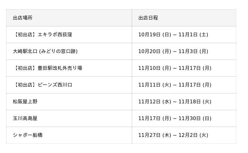 ※出店日程は予告なく変更になる場合がございます。予めご了承ください。