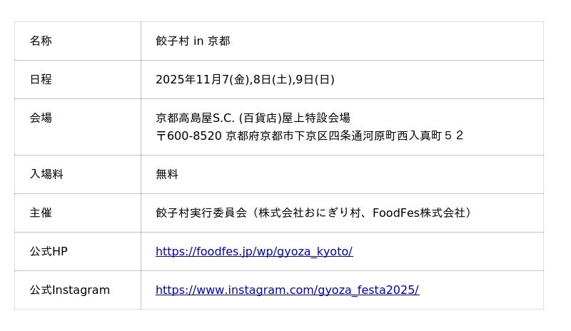 株式会社おにぎり村(代表取締役:池尾俊哉)とFoodFes株式会社(代表取締役:稲垣一馬)は2025年11月7日(金),8日(土),9日(日)の3日間、京都高島屋S.C. (百貨店)屋上特設会場にて「餃子村 in 京都」を開催いたします。