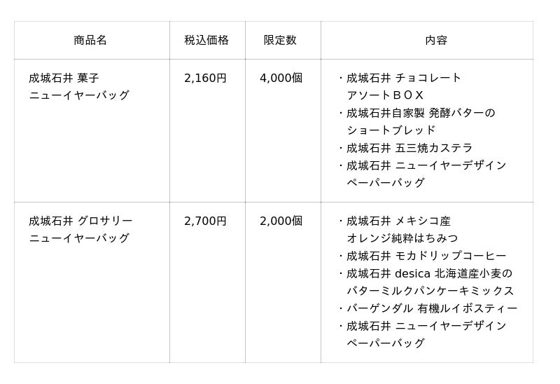 株式会社成城石井(本社事務所:神奈川県横浜市西区みなとみらい、代表取締役社長:後藤勝基)は、「成城石井 福袋 2026」のご予約受付を11月1日(土)より開始いたします。店頭受取WEB予約サービス(https://www.seijoishii.jp/)にてご予約の上、店舗でお受け取りいただく「店頭限定福袋」の他、公式オンラインショップ「成城石井.com」( https://seijoishii.com/ )および他社ECモールにてご予約いただく「オンライン限定福袋」を販売いたします。