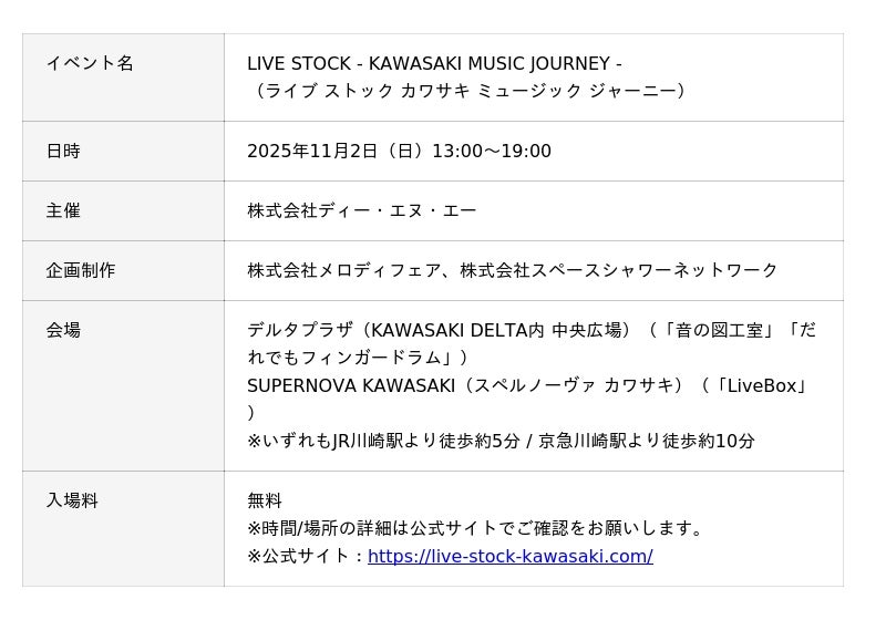 ヤマハ株式会社(以下、当社)は、11月2日(日)に株式会社ディー・エヌ・エー(以下、DeNA)が主催する川崎市の音楽イベント「LIVE STOCK - KAWASAKI MUSIC JOURNEY -」に出展します。「LIVE STOCK - KAWASAKI MUSIC JOURNEY - 」は、川崎駅周辺の各イベントを横断的に繋ぐ共通テーマ「101 - Next New Challenge - 次の100年へ向けた、新たな挑戦のはじまり」の主軸コンテンツの一つとして開催される音楽ライブイベントです。