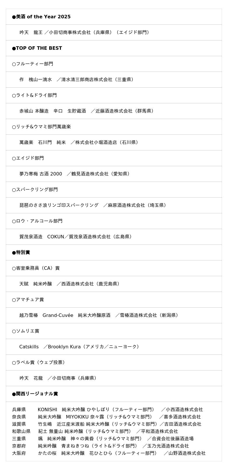 ▼『美酒 of the Year2025』1銘柄、『TOP OF THE BEST』6銘柄、『特別賞』11銘柄