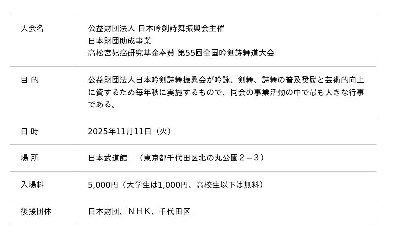公益財団法人日本吟剣詩舞振興会(以下「財団」という)は、2025年11月11日(火)日本武道館にて、