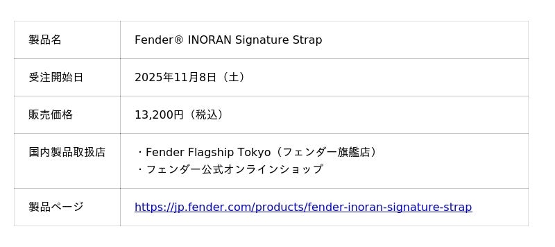 フェンダーミュージック株式会社(所在地:東京都渋谷区、代表取締役社長 アジアパシフィック統括 エドワード・コール)は、LUNA SEAのギタリストとして、またソロアーティストとしても精力的に活動を続けるINORANが監修した特別仕様のシグネイチャーストラップ『Fender(R) INORAN Signature Strap』を2025年11月8日(土)に発売します。(本製品は、旗艦店Fender Flagship Tokyoおよびフェンダー公式オンラインショップ限定での販売となります。)