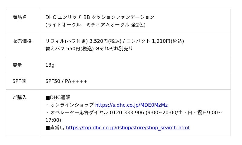 株式会社ディーエイチシー(本社:東京都港区、代表取締役社長:宮崎緑、以下:DHC)は、大人の肌悩みを徹底カバー※1する1品7役のハイカバーファンデーション「DHC エンリッチ BB クッションファンデーション」を2025年11月6日(木)に新発売いたします。