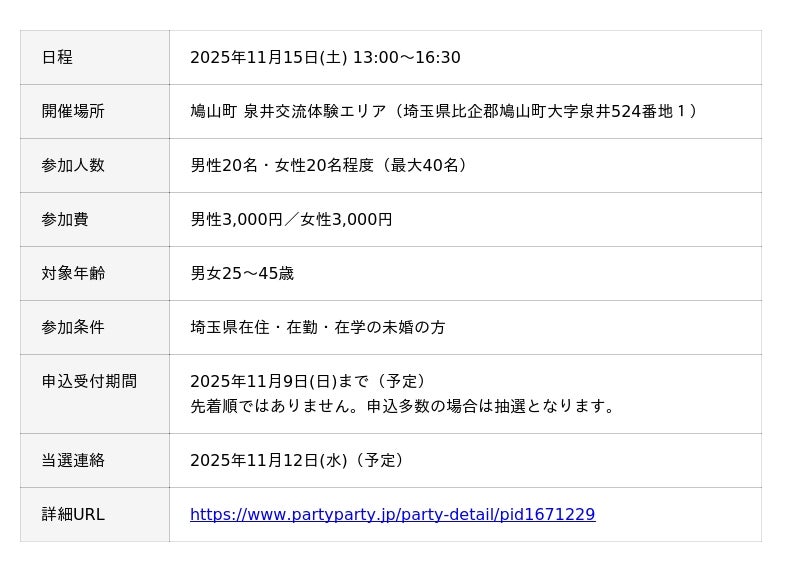国内最多*の成婚数を誇る株式会社IBJ(代表取締役社長:石坂茂、本社:東京都新宿区、東証プライム:6071、以下「「IBJ」)が運営する婚活パーティーサービス「IBJ Matching」は、埼玉県川越都市圏まちづくり協議会(通称:レインボー協議会)からの委託により、2025年11月15日(土)13時より埼玉県比企郡鳩山町の「泉井交流体験エリア」にて、“スイーツビュッフェ×出会い”をテーマにした「カフェコン」を開催いたします。参加対象者は埼玉県在住・在勤・在学の未婚の男女25~45歳の方で、スイーツを楽しみながら交流できる最大40名規模の婚活パーティーです。