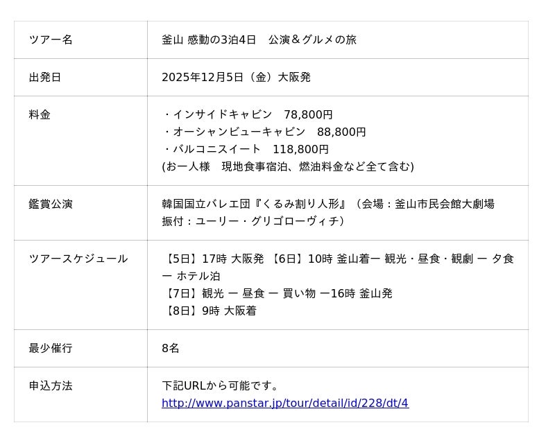 (株)サンスターライン 旅客営業企画「海外でバレエを観る――そんな特別な体験を、気軽な船旅で楽しめるのが本ツアーの魅力です。現地では専用車と日本語対応スタッフがサポートし、安心してご参加いただけます。釜山の劇場で味わう『くるみ割り人形』の舞台と、美食・船旅が織りなす冬のひとときを、心ゆくまでお楽しみください。」