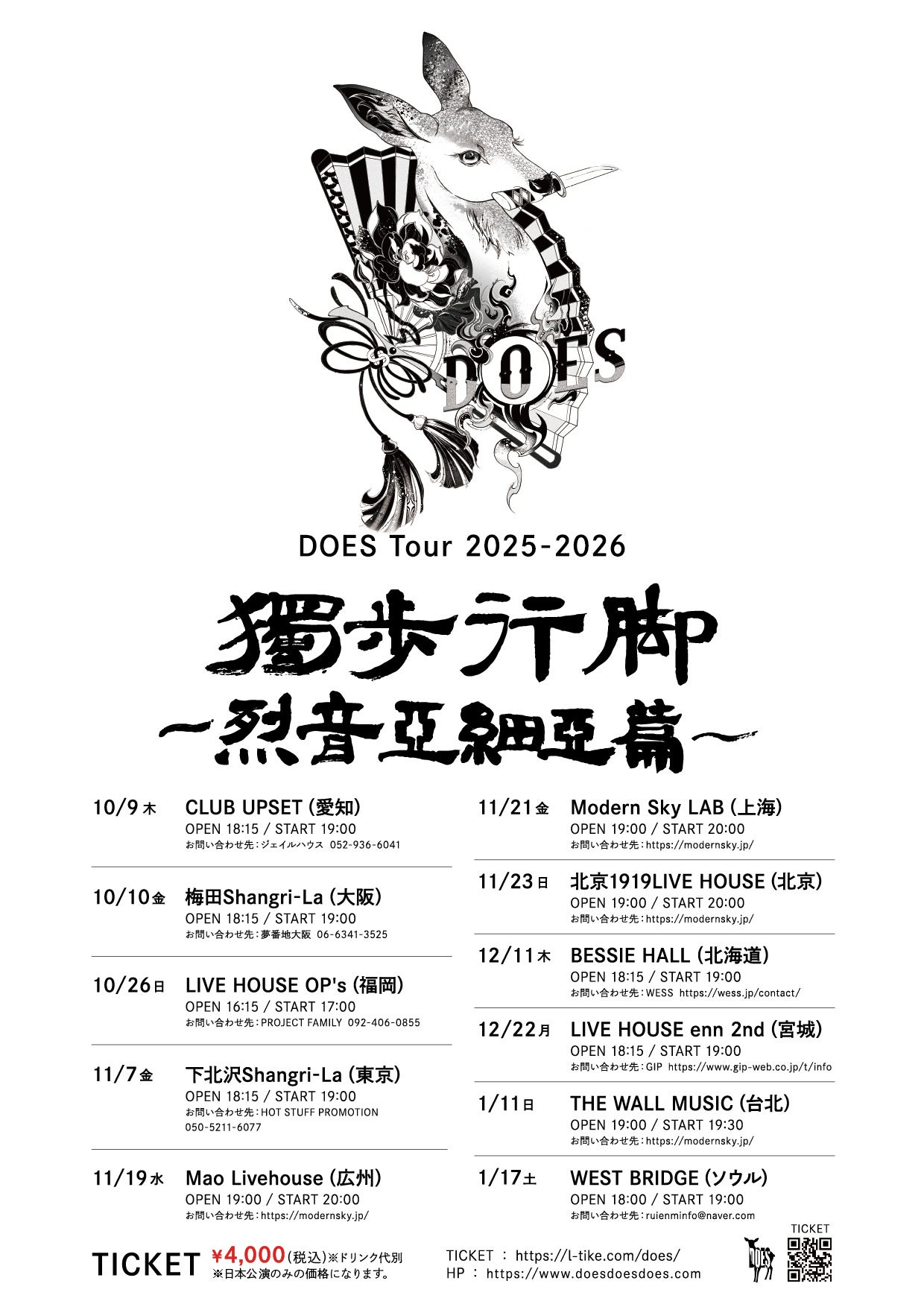 ロックバンド DOES が開催中のワンマンツアー「独歩行脚~烈音亜細亜篇~」の2025年11月7日(金)下北沢Shangri-Laで開催された東京公演、そして2026年1月11日(日)台北・THE WALL MUSICで開催予定の台湾公演が、ともにSOLD OUTとなった。