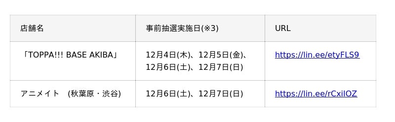 「TOPPA!!! BASE AKIBA」と、アニメイト秋葉原・渋谷のサテライトショップでは、一部日程の入場について混雑緩和のためLINEアプリを利用した事前抽選を行います。(※2)
