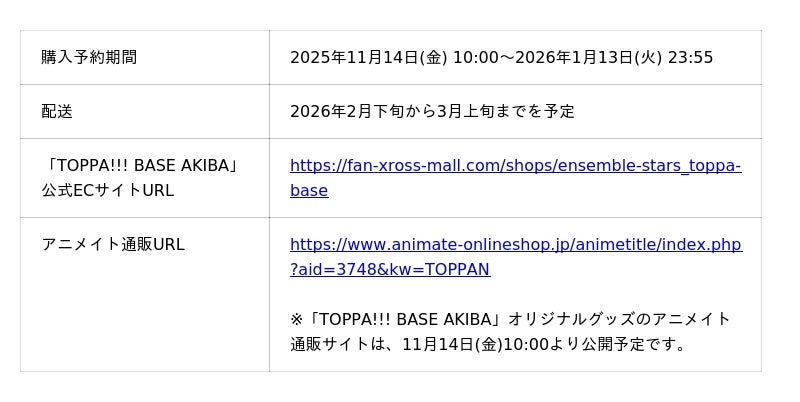 また、2025年12月6日(土)から12月21日(日)までアニメイト秋葉原・渋谷のサテライトショップ内でもグッズを販売します。そして、「TOPPA!!! BASE AKIBA」公式ECサイトやアニメイト通販で購入予約も実施します。