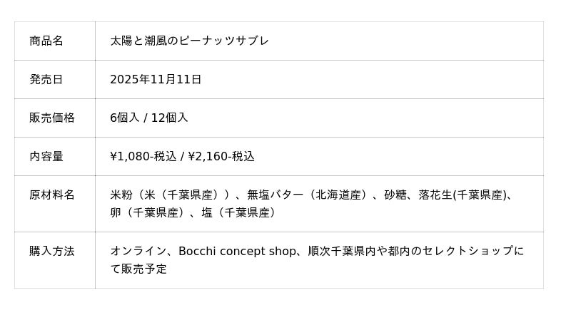 株式会社セガワの落花生加工品ブランド「Bocchi(ぼっち)」(所在地:千葉県旭市神宮寺8323-6、代表:加瀬宏行)は、2025年11月11日「ピーナッツの日」に新商品『太陽と潮風のピーナッツサブレ』を発売開始します。