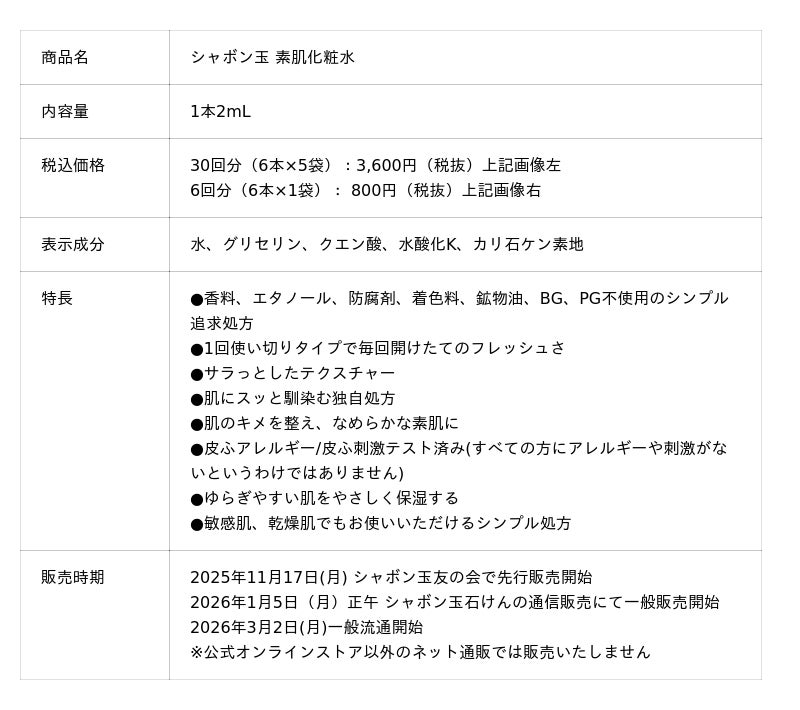 2025年11月17日(月)シャボン玉友の会で先行販売開始/2026年1月5日(月)正午 シャボン玉石けん通信販売にて一般販売開始/2026年3月2日(月)一般流通開始