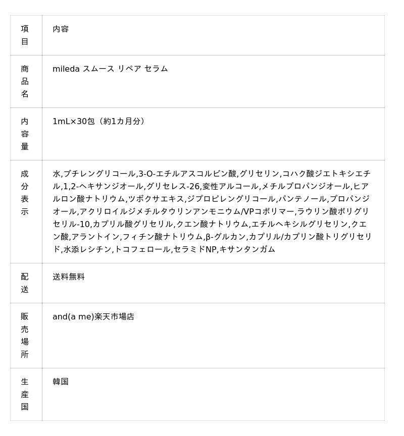 項目内容商品名スムース リペア セラム内容量1mL×30包(約1カ月分)配合成分3-O-エチルアスコルビン酸(ビタミンC誘導体/保湿成分)ツボクサエキス(CICA/保湿成分)セラミドNP(保湿成分)<br>ヒアルロン酸ナトリウム(保湿成分)