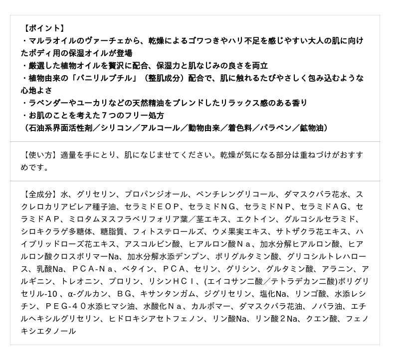 ヴァーチェのブランドキー成分であるマルラオイル(※1)をはじめ、アボカド油、ブドウ種子油などの厳選した植物オイルを配合。優れた保湿力でありながら、ベタつかず軽い使い心地。乾燥によるゴワつきやハリ不足を感じやすい大人の肌に、全身へリッチなうるおいを届けます。(※2)
